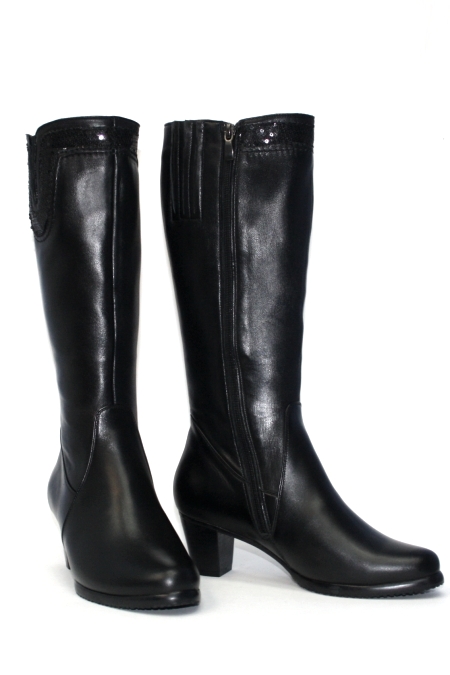 Описание: Качественные женственные сапоги из натуральной кожи на невысоком устойчивом каблуке. Нескользящая рифленая подошва. Сбоку предусмотрена молния-застежка. Закругленная форма носка. Голенище изготовлено из шевро (мягкая эластичная кожа) и украшено декоративной отделкой. С наружной и внутренней стороны голенища предусмотрены две резинки для регулировки полноты икр.